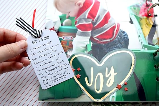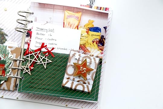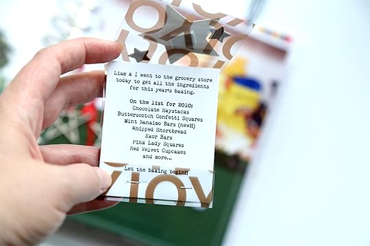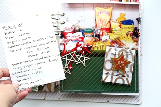 My story for day 15 was about grocery shopping for my baking ingredients. Baking is a big deal for me around the holidays. My baked goods list is long and my shopping list is MUCH longer! I happened to have the original list saved in my ephemera pile and I thought it would be fun to include in my album. Ephemera + pockets makes for an easy page design.