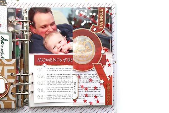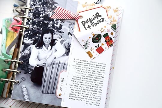 3x8 transparency and journaling card setdie cut labels Ali’s Christmas phrases 4x6 stamp set Red and white trim packDecember Daily Main Kit (patterned vellum, chipboard stars)Project #3