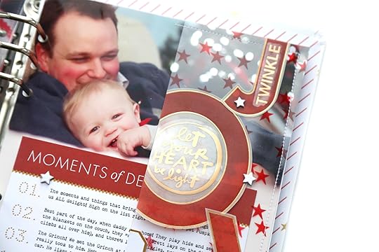 I ran the 4x6 journaling card through my printer to add the text, and all that was left to do was tuck it inside the pocket for safe keeping. The functionality of the see through elements in this layout make me so happy! I love the look of the stars layered on top of the Christmas lights in the background!