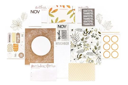 The kit now includes a sheet of vellum or transparency (sized outside the page protector in a 6 inch x 8 inch album), a pattern paper, a 3 inch x 8 inch (outside the page protector) journal card with the month at the top which will be repeated each month, a 3 inch x 4 inch stamp set, chipboard, 4, 3 inch x 4 inch journal cards, 3, 4 inch x 6 inch journal cards and an embellishment.