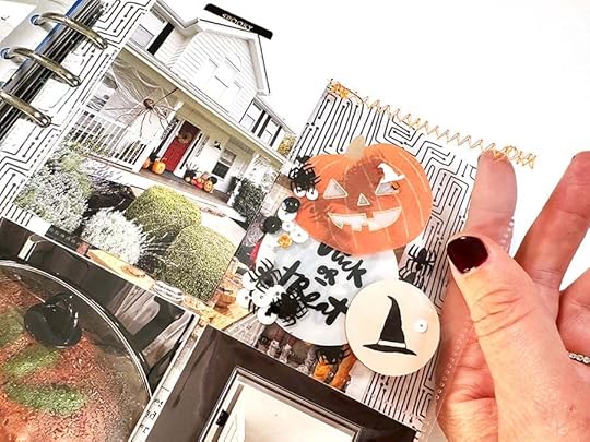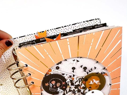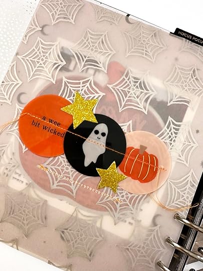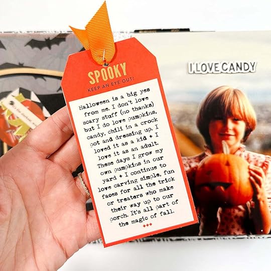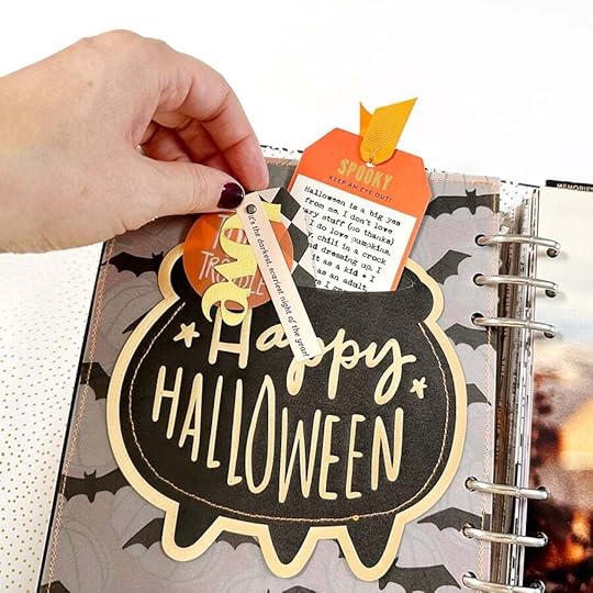 On the back of the shaker page I adhered the "this is halloween" pattern paper. I then created an intro page using the pumpkin vellum and one of the large die cuts from the 2023 kit. I used the digital version of this tag to set up my journaling and then temporarily adhered the actual tag to the printed paper in order to print directly onto the tag.