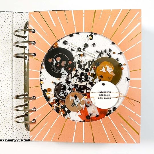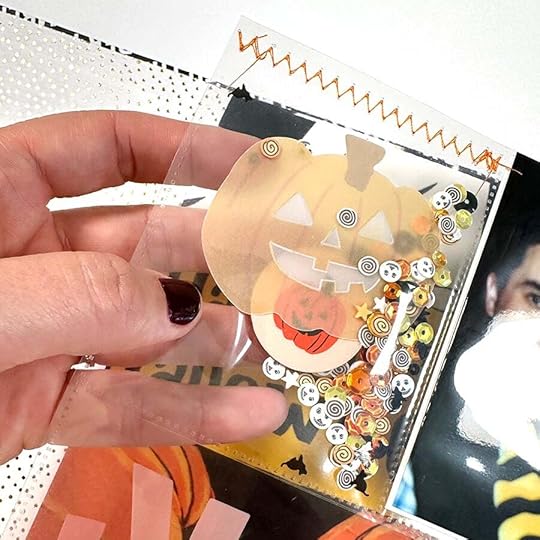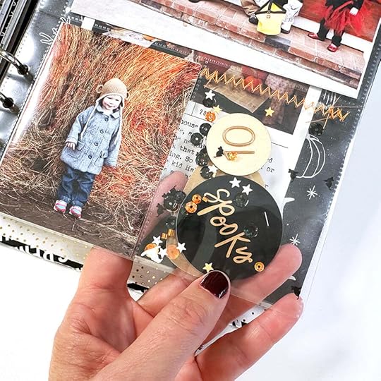 And followed the same steps as above for creating another shaker pocket. This one includes the numbers for the year on the vellum pumpkin and I added two plastic circles stapled back to back.
