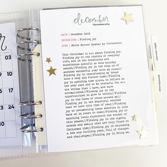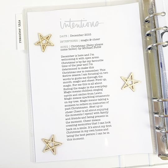 Being my first year, the intentions page for my 2015 album was almost identical to Ali’s. I used wood veneer stars from my stash but kept the layout the same. One thing I noticed and really liked about my earlier intentions pages was that they included words that I wanted to focus on, as well as a song that captured the mood for the season.