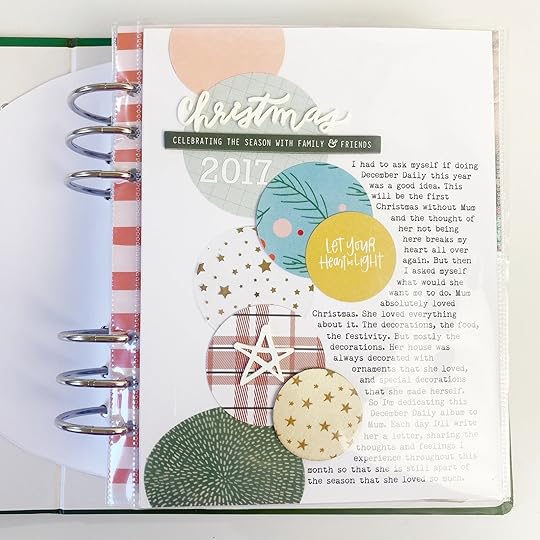 2017 was a tough year. I lost my mum in June and wasn’t sure I had it in me to celebrate the season let alone document it. Mum absolutely loved Christmas, so after a bit of thinking I came to the conclusion that if she could talk to me right now, she’d tell me to do it, and to be happy doing it. So, I did. I used my intentions page to document how I was feeling about entering December, and how I was going to be approaching my journaling for the month. The design of the page also shows I was beginning to experiment with more crafty elements. I do believe the circle design was scrap-lifted from a fellow December Daily participant, but I unfortunately can’t find who they are to credit them. If it was you, thank you!
