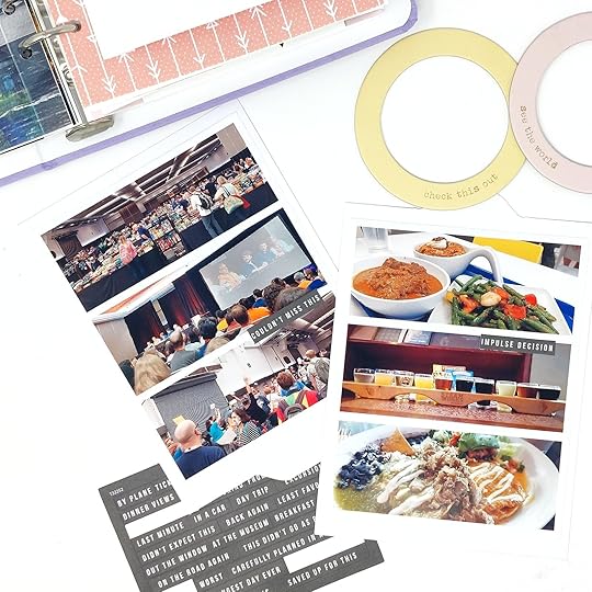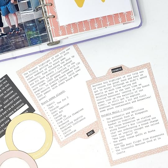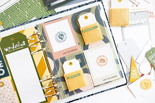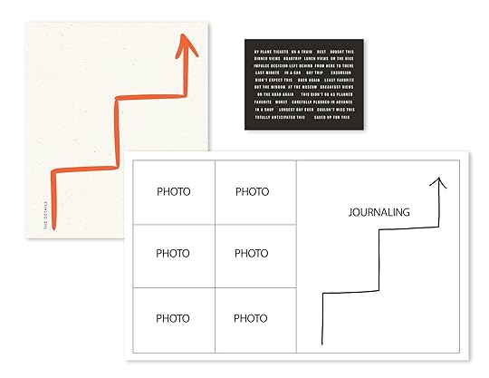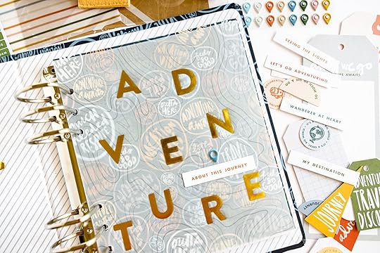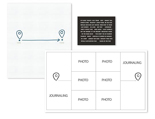 The star of this spread is going to be the Arrow Circles 12x12 patterned paper. My plan is to cut the 12x12 paper down to 7x8.25 and then cut that in half to fill the bottom of the first page and the top of the second page. With the left-over paper, I will use a circle punch to punch out some of the arrow circles and add them with foam squares on top of the paper on my spread. I am also considering using either the 12x12 Mountain Symbol patterned paper or the 12x12 Topo Map patterned paper to fill the other halves of my pages. This would be if I decided to use six small cut out photos/journaling blocks instead of a photo/journaling collage. Here’s some ideas for things to document: