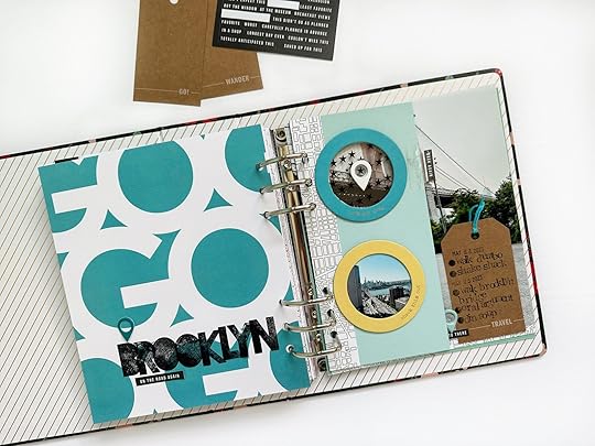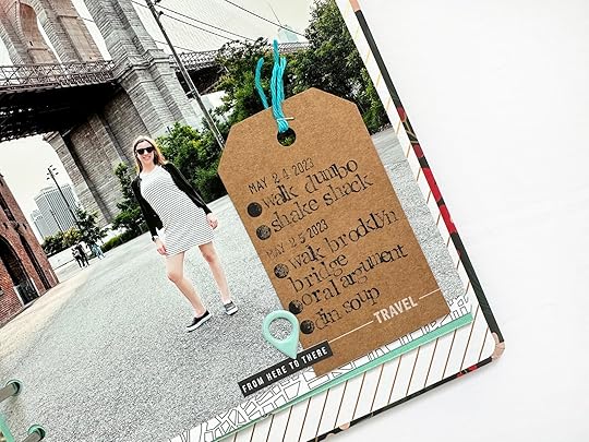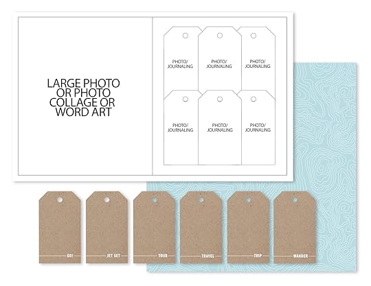 For this spread, I am going to use the kraft tags to document six favorite states that my boyfriend and I have traveled to together. I am thinking that I will create two clear pockets on top of one of the pattern papers. I like the way the kraft tags look on top of the 12x12 Topo Map patterned paper. Perhaps a photo on one side of each tag and my journaling on the other side. The first page may be a full-page photo or some word art. I haven’t quite decided that part yet. You could also do a photo collage on the first page. The other idea that popped into my head as I type this is to cut a piece of the 12x12 U.S. Map patterned paper for the base of the first page! That would be cool! If you don’t want to use these tags for a travel page, you could always cover the sides with the travel themed words with a photo and journal on the other side. As I was creating sketches for this kit, I was always on the lookout for ways to use the components other than for travel. This sketch could also be great for: