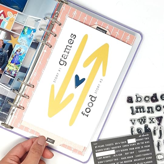I decided to use one of the foundation pages that I had created in that video to make a page in my 5x8 album documenting our trip to Vancouver for a board game convention last year. With the “Story #1” and “Story #2” prompt, I decided to document the two major highlights of our trip: the board games and the food! First, I used the typewriter font stamp in the Ali Edwards / Laura Wonsik “Alpha Varieties” stamp set to stamp out the word “Games” beside “Story #1” and the word “Food” beside “Story #2” to indicate which pull-out was documenting which story.