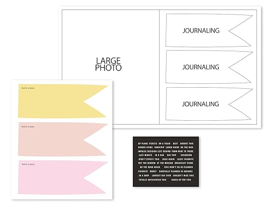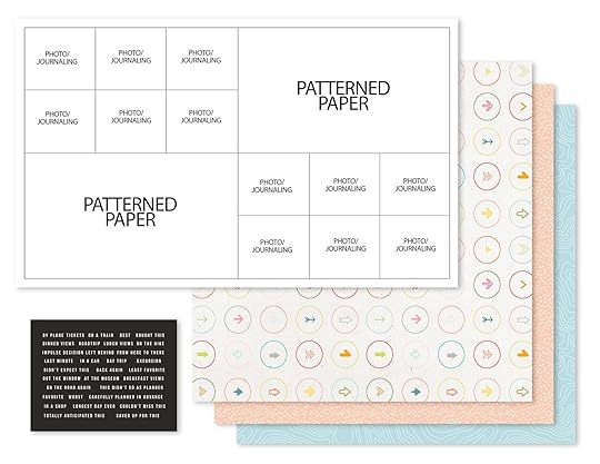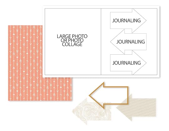 For this page idea, I want to have a full-page photo alongside the 7x8.25 Arrow Pattern paper. The three plastic arrows fit pretty nicely on the paper stacked on top of one another. There is a tiny bit of overhang that can be trimmed off. I’m thinking about typing my journaling and then cutting it out in the shape of the arrows. The arrows could then be placed on top of the journaling. They can be added with washi tape as a hinge or with brads to swing them aside (or even just lifted up). I am also imaging that I could go through my stash to find some embellishments to put on top of the arrows. This sketch is pretty generic and can be used for just about anything. Perhaps I will tell a story about myself! Other ideas could include: