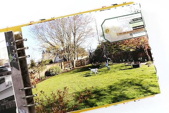 My second project today was sparked by a photo Aaron took of himself outside his office door (that goes into our backyard). As soon as he texted it to me I walked downstairs to take my own photo in the same spot. I love having these two photos together! To tell the story of these images I used one of the 3x4 cards (digital) to create a 3x8 journal card (you can simply make it longer on the bottom of the card in Photoshop). Rather than use a 3x8 inch page protector I decided to use a page attacher instead. Along the outside edge I added an Avery Index Tab with a sentiment from the 3x4 stamp set.