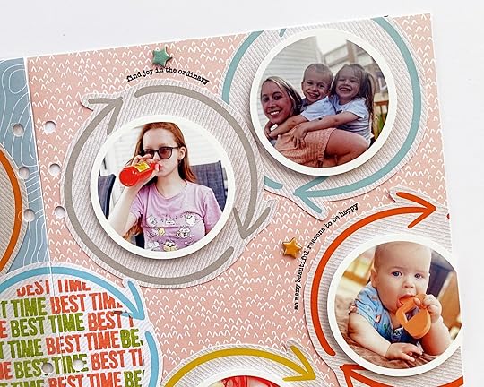 You can see in my photos that I also did some stamping. Inside of the circle that goes across both pages, I stamped “the best” multiple times using two different ink colors. I stamped numbers above the journaling on each chipboard piece and then stamped a few phrases around the outside of some of the fussy cut circles. The date and some chipboard stars were added at the end to finish the spread off.