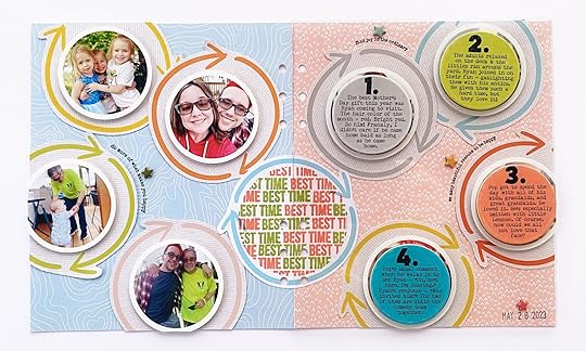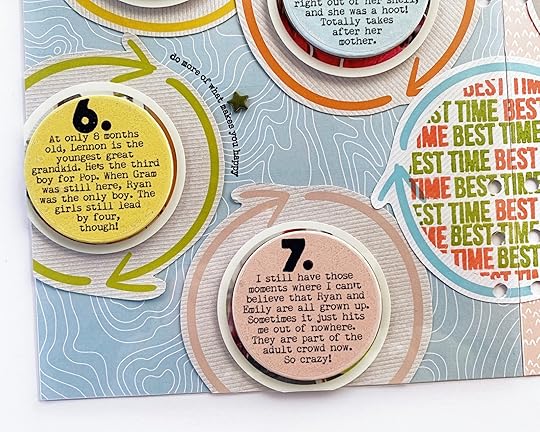 I typed and formatted my journaling in PSE inside of 2 inch circles. I printed them out on 8.5x11 sticker paper and punched each of them out with a 2 INCcircle punch. Then it was as simple as just peeling off the sticker backing and adhering the journaling to each of the chipboard circles.