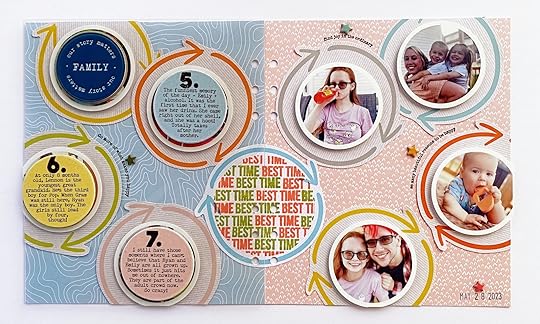 On the back of the 3x8 I added pattern paper from the Labels Scrapbook Kit. On top of that I added three of the circle stickers from the kit and stamped numbers and a camera on each one before writing a couple sentiments on each one. I paired those with a chipboard circle from the January 2023 Stories By The Month kit.