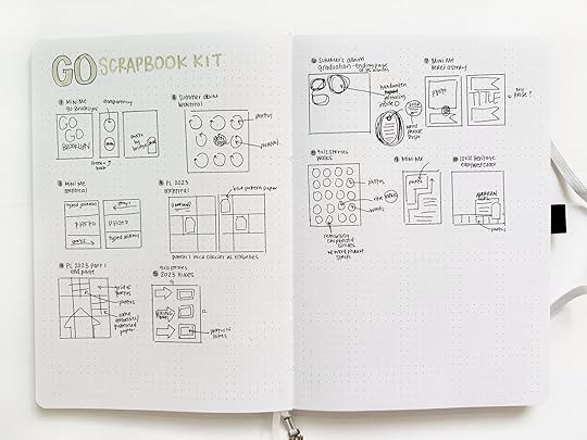 Next, I go through the products again and begin lumping together the products I want to use in a specific project and sketching out the project ideas. I also make note of the album I will add it into, the specific story I want to tell, any specific photos I want to include, and which products I want to use.
