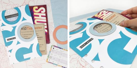 For my next foundation page, I used the 6x8 teal patterned paper with the word “GO” with some of the round chipboard frames that came in the Scrapbook Kit to make a pocket page for my travel album. First, I used a 2.25” Circle Punch to punch out the insides of each of the letter “O”s on the patterned paper. Then, I backed two of the round chipboard frames with acetate before adhering them down around the punched-out “O”s. And finally, I made the whole page into a pocket by adhering the 6x8 green map patterned paper along the top and bottom edges with some paper hinges. This pocket will be perfect for storing some of the flat memorabilia that I collected during my trip, such as receipts, game score cards, and beer flight lists!