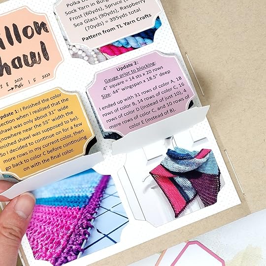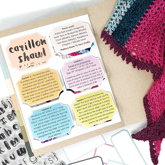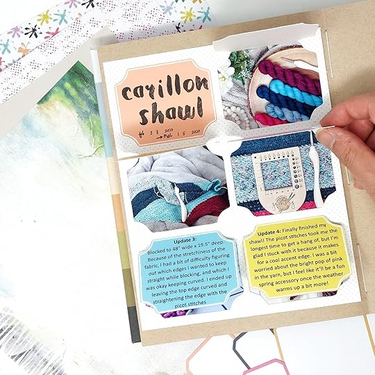 I decided to use one of my foundation pages to add a layout in my “Make” Story Album, documenting a crochet shawl that I recently finished making. (For more information about my “Make” Story Album, check out my Guest Storyteller lesson in the “Make” Story Kit Classroom. In my last blog post, I had shared how this 6x8 Pastel Labels patterned paper would look with 3 of the 6 labels converted into little flip-ups with photos underneath them. For this layout, I ended up converting 2 more of the labels into flip-ups so that I could document all the process photos I took while I was making my shawl, leaving the label in the top left corner flat so that I could stamp out my title “Carillon Shawl” (I used the “Alpha Varieties” Stamp Set) and add the dates when I started and completed this project.