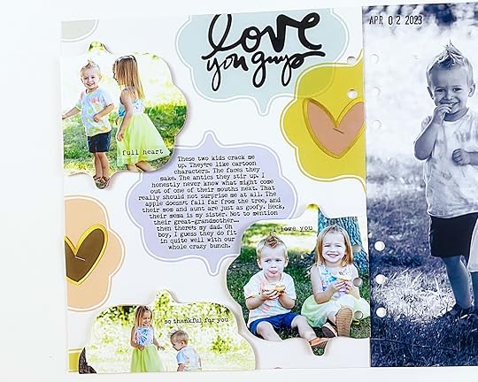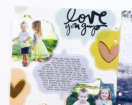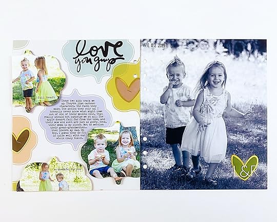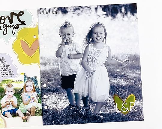 To bring my two pages together, I added a third heart on my full page photo. I finished off by adding puffy letter stickers to that heart with my great neice and nephew’s intitials.