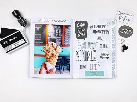 I knew I wanted to bring my own unique style to this project by doing what I do best and that’s stamping. For a few years now, I’ve been using my stamps to create fun Mind Maps in my projects. These mind maps are a great way to tell your story through icons and words. So I used that same concept and highlighted the top stories of my day with a mind map. I love that my mind maps captured everything important from the day without having to use photos.