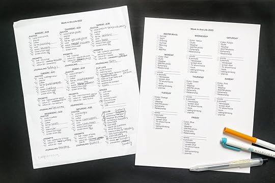 Before the week begins, I like to create a checklist of the items I am seeking out during the week and print it out so I can refer back to it each day as I collect my photos. In the picture above you can see my used list from last year and my new prepped list for this year.