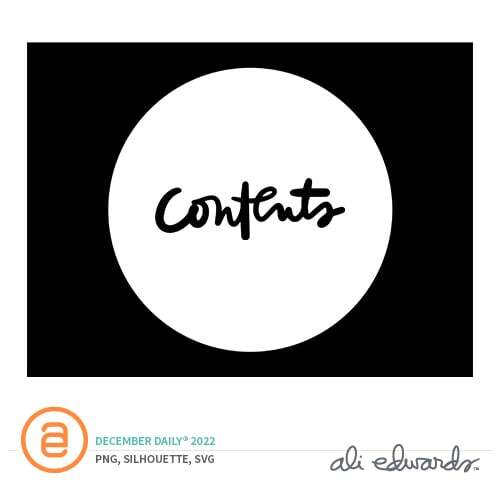 On the back of the first page (second side of the large circle window) I added the word "contents" as I decided to play around with creating a table of contents page for this project - similar to what I did earlier this year with the Begin Story Kit. The digital word art "contents" is included in the download above. I used my Silhouette to cut it out and then embossed it using gold embossing powder.
