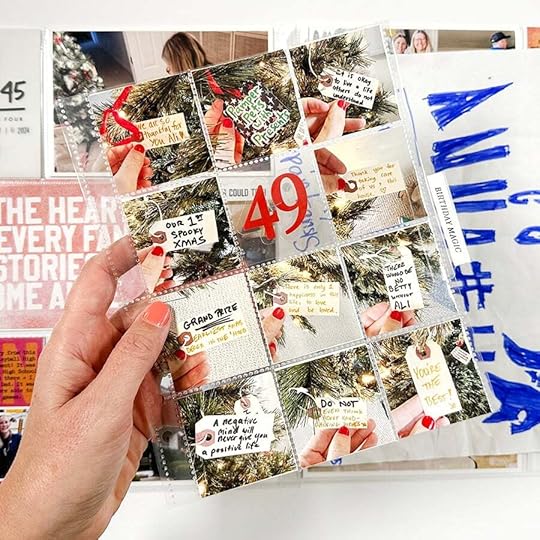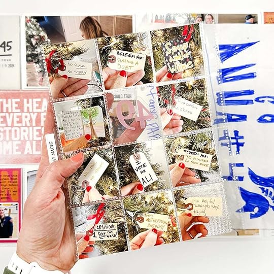 For my Birthday this year Aaron and the kids set up a little Christmas tree and wrote a bunch of message, quote, and coupon tags. It was such a fun gift idea! I took photos of each of the tags and cropped them to 2 inch x 2 inch to fit this page protector. I added the plastic numbers to designate my age.