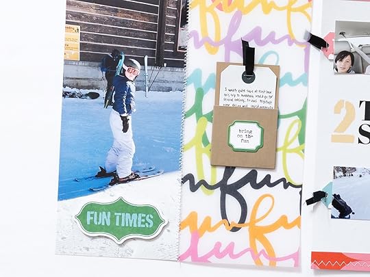 I still wanted to include journaling about the photos though, so I decided to make some fun tags using the top portions of the 3” x 4” “This was fun” cards. I cut these into tag shapes and added my journaling on the back of the tags. This also gave me a chance to try out the new Borders 4x6 stamp, which I used to decorate the tags!