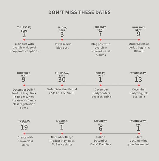 Thursday, September 30th | December Daily® Order Selection period ends at 11:59 Eastern and shipping will begin October 1st. Any remaining products will move into the shop and regular shipping rates will apply.Wednesday October 13th | December Daily® Digitals available. Tuesday October 19th | Create With Canva class begins (more details to come soon)