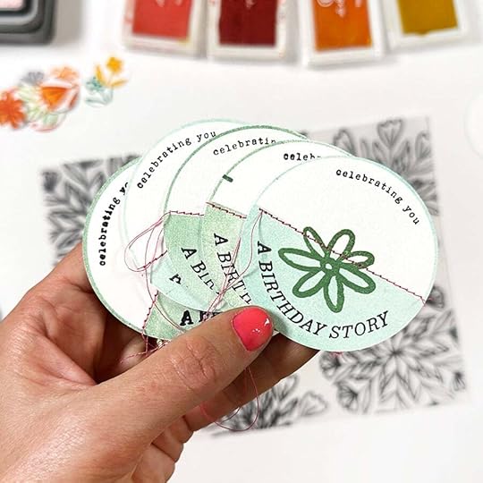 I used an older stamp set that has a bunch of outlined, half-filled shapes to start my circles. I used a 2.5 inch circle punch to punch those out before using the Birthday Story Stamp (we have some of these in stock) on top. I curved the "a birthday story" and "celebrating you" on my stamp block to fit this particular circle. Next I added the floral outline stamp before running my circles through my sewing machine with some dark pink thread.
