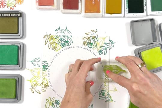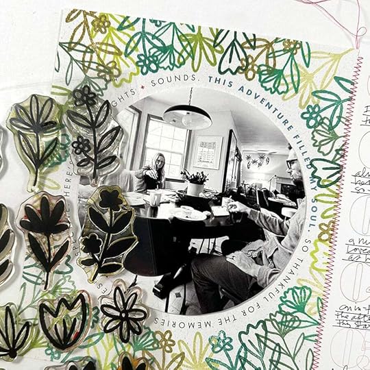 One of the first things I knew I wanted to do was create some kind of frame using the flowers. I did some warm up stamping first and then stamped a border using a bunch of green inks from Tim Holtz around the outside of a pattern paper from last year's travel collection. Love stamping on top of these prompt papers to make them my own.