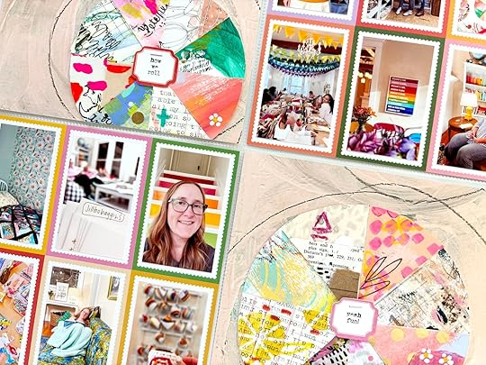 I took a lot of photos of my friends and the gorgeous house so I decided to use the 12 paper with the multi-colored scalloped rectangles to hold my photos. But I didn't want one large block of photos, so I decided to cut it into 4 6x6 pieces to make a grid that paired the photos with squares of mixed media. I used an old Becky Higgins page protector for this but you can easily create this on a 12x12 canvas.