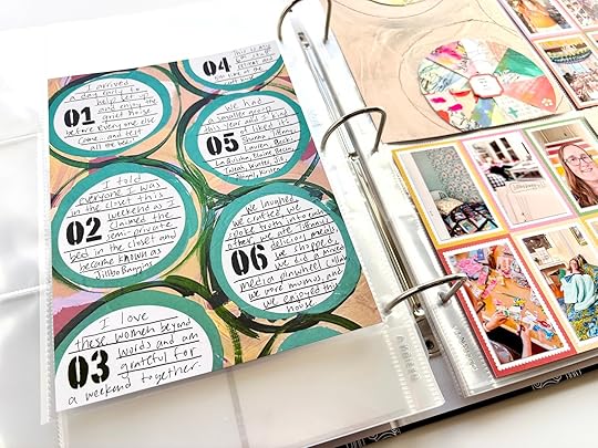 The numbered 6x8 paper was the perfect home for all of my stories from the weekend, and I paired that with one of my favorite photos (looking into the crafting space from outside) on the other side. One of the circle die cuts paired with some basic info typed on my typewriter made for the perfect title.