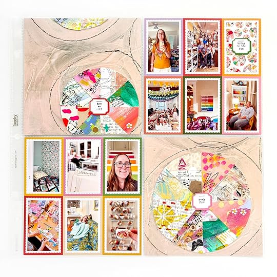 I also cut up the 12x12 mixed media paper to fill the other alternating pockets. I love how the light peachy background gives the eyes a bit of rest from the multi colored rectangles and photos. I was excited to figure out that the mixed media paper also made a perfect home for some mixed media pie charts that we made during the retreat. I hated covering Ali's artwork but it was such a perfect fit that I went for it anyways. I made sure to include some of Ali's art on the back side though!