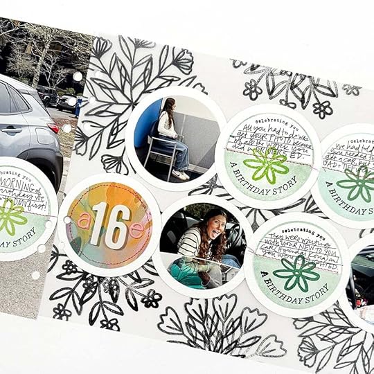 As you can see above, this project started with creating the background pattern on the vellum using outline flowers from this stamp set. On top of that custom background paper I added a series of circles and photos to tell my story.