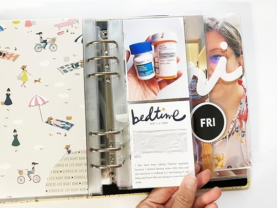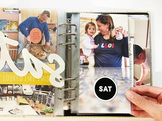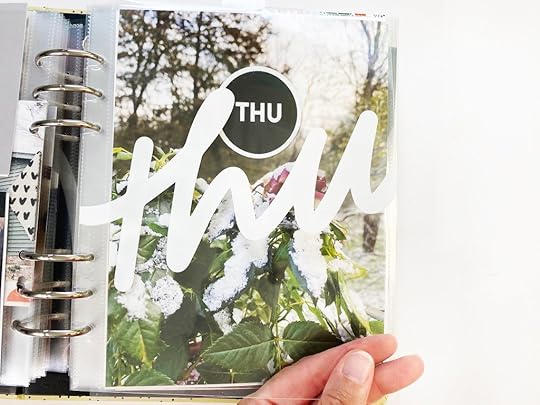 This year I decided to not use any divided page protectors and just adhere my pages back to back. My base pages ended up 6.625 inches by 8 inches and I included a few smaller inserts. I started each day with the day of the week transparency & a full page photo. Then I added the bulk of my journaling printed out with the “Monday Looks Like This” from the 4x6 cards in Ali’s mini kit & the 3x8 kraft daily sheets. I allowed this title card to dictate the color that I used for the rest of the embellishments for each day.