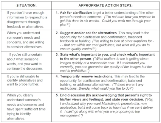 1. Ask for clarification to get a better understanding of the other person’s needs or concerns. (“I’m not sure how you propose to get this done in six weeks. Could you walk me through your plan?”)