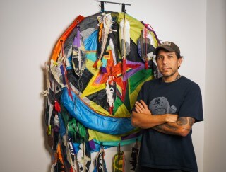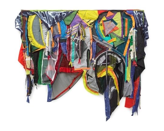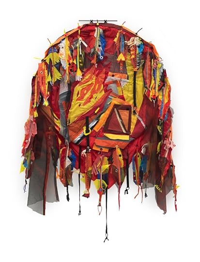 After joining the water protectors at the Dakota Access Pipeline in 2016, Fields began to give the Indigenous history of hope and struggle a greater focus in his work. In the 2017 series Tent Metaphor Standing Rock, the artist recovered tents after the infamous February 22, 2017 police raid on the protesters, sewing the recovered material into shapes resembling coffins, sleeping bags, or kites. Fields first worked with tents—a mainstay of middle-class camping holidays— after witnessing Seattle’s brightly colored homeless encampments. His interest only increased after noticing the structure’s role in modern protest movements. The artist recombines the vivid material into traditional Indigenous patterns, anti-pipeline slogans like “Stop the Black Snake,” and into dynamic, compelling abstract compositions. In its totality, the series blurs the boundaries between political polemic and abstraction, between distress, resistance, and hope.
