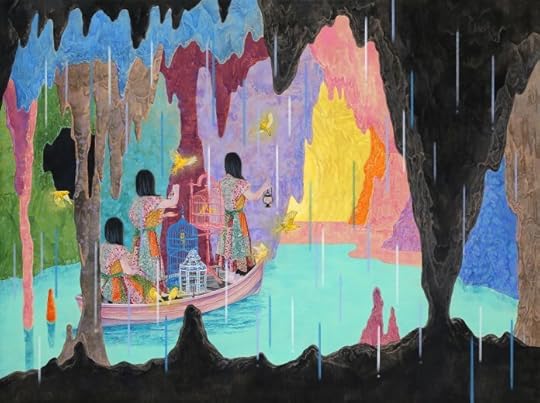 Canary Cave, 2025, Acrylic on raw canvas, 38.2 × 51.3 in.