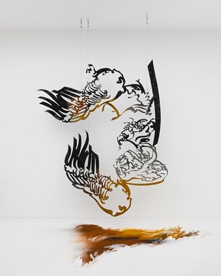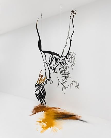 Monia Ben Hamouda Denial of a Red-Winged Blackbird (Aniconism As Figurative Urgency), 2022 laser-cut steel, spice powders, charcoal 86 1/4 x 76 3/8 x 3/64 inches (219 x 194 x 0.3 centimeters). photo credit: ASHES/ASHES, New York and ChertLüdde, Berlin.