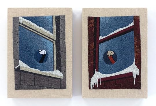Peter Frederiksen, Massey Klein Gallery, “out from under rocks, clearing the crust from dreary eyes and seeing friends again”, 2022, Freehand machine embroidery on linen, Each panel 7 x 5 inches, Overall 7 x 10 inches. Image courtesy of Massey Klein Gallery and The Artist.