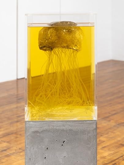 Silas Inoue Future Friture-Turritopsis Dohrnii, 2022 Sugar, silicon and cooking oil in acrylic aquarium on concrete plinth 42 1/8 x 13 x 13 in (107 x 33 x 33 cm) Photo Credit: Jason Mandella Courtesy of Ulterior Gallery, New York