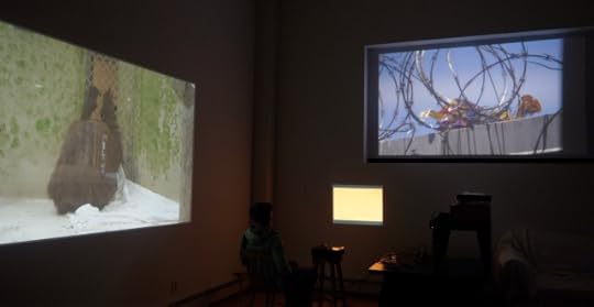 Installation view of Inside Remote Viewing and the Recreational Vehicle, a three-channel video installation installed in Ridgewood, Queens in October 2021. Sponsored by City Artist Corps/NYFA