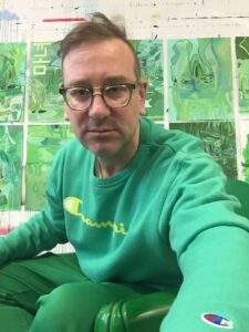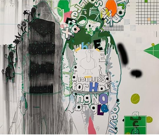 Known for combining high and low culture through elements of painting, drawing, graphic design, animation, and collage, Bevilacqua characteristically works in a saturated palette, covering his glossy canvases with brand logos and doodles.