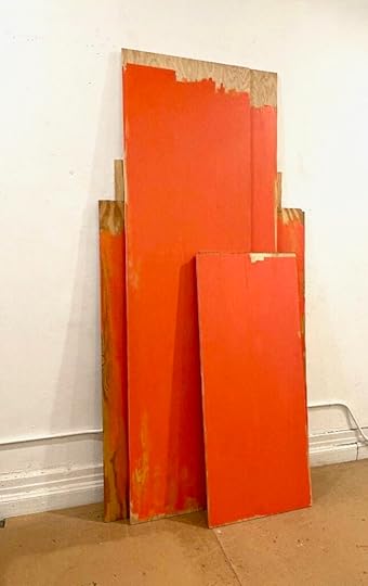 Stacked Orange, 2021 Polyurethane and Acrylic on plywood (7) plates stacked against the wall 96 x 48 x 15 inches, (243.8 x 121.9 x 38 cm)