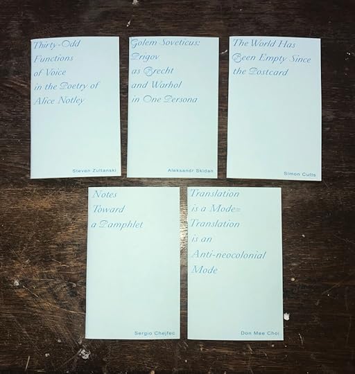 The first batch of the 2020 Pamphlet Series, with work from Simon Cutts, Sergio Chejfec, Don Mee Choi, Steven Zultanski, and Aleksandr Skidan.