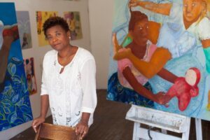 She is represented in numerous private and public collections, including The Montclair Art Museum; The Kalamazoo Art Institute; The Mint Museum of Art; Smith College Museum of Art; Hampton University Museum; Sheldon Art Museum; Mott-Warsh Art Collection, and AT&T. Her public works includes fusedglass murals created for the MTA Arts in Transit Program at the Livonia Avenue Subway Station in Brooklyn, a poster for the MTA Poetry In Motion and — for the NYC School Authority — a mosaic mural in the Glenwood Campus School. She currently teaches painting at Pratt Institute and Hunter College in NYC.
