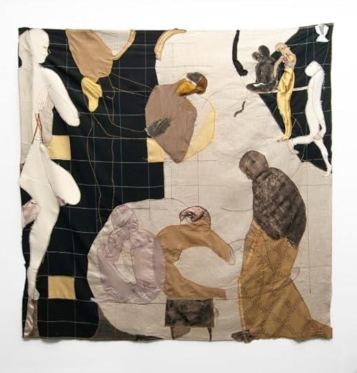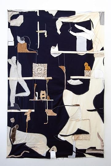 Shelved, 2025, found fabric and collagraph prints, 59in x 38.5in