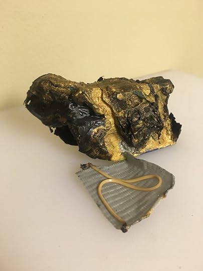 Ash Canary, 2020. Hand sanitizer on painted cardboard effigy, ~ 5″ x 4″ x 3″