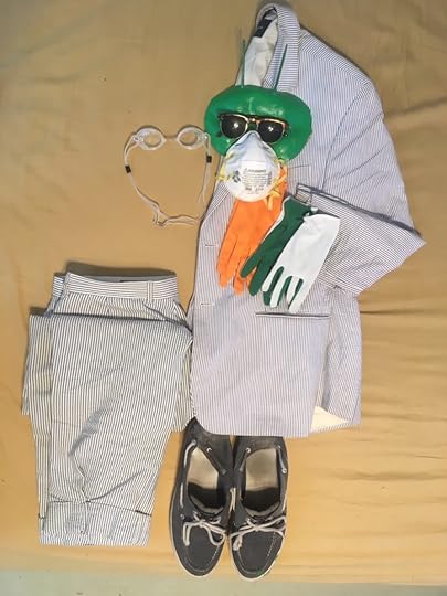 Alien Space Suit, 2020. Performance/Costume: Seersucker suit, N95 respirator, goggles, sunglasses, gloves, boat shoes, and latex mask.