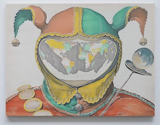 Fool’s Cap Map of the World, 2019, wax-resist acrylic paint washes and crayon on linen 30 x 40 inches