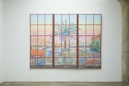 Monday Evening Studio View, 2020, wax-resist acrylic paint washes and crayon on linen 92 x 120 inches
