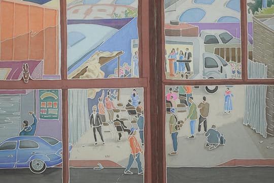 Detail: Monday Evening Studio View, 2020, wax-resist acrylic paint washes and crayon on linen 92 x 120 inches